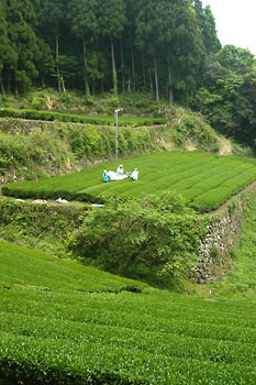 | 烏山の茶園 標高600m 品種:ヤブキタ 県境の山々を背景にお茶摘みをしています。 |