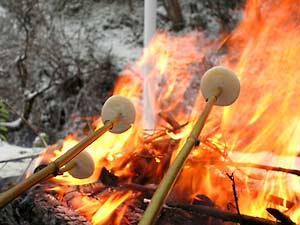 良い熾きが出来たら、火のそばの灰の中にサツマイモを埋めて、焼けた餅を食べながら・・・