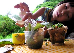 反面子供たちは、せっかくの週末なのに雨のおかげで退屈気味。珠美は、玄関の軒先でままごと遊びを始めました。「パフェ」を作っています。