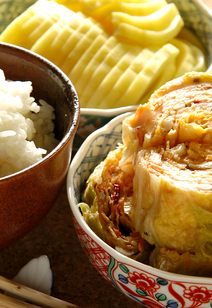 唐辛子・にんにく・しょうが・あみ漬けなどを混ぜて作った具を、白菜漬けの葉の一枚一枚に挟み込んで漬け込んだ朝鮮漬け。