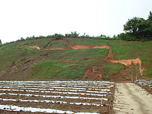 2001年6月19日大雨情報 朝から断続的に猛烈な勢いで雨が降り続きました。 日出集落のあちこちでも2〜3ヶ所の土砂崩れがあり、茶畑や道路で被害がありました。 一番の気がかりが造成したばかりの茶畑・・・。 6月20日の朝になってようやく小康状態となり、幾分ほっとしています。 被害も、1日の降水量が300ミリ以上の割には最小限と言えるのではないかと思います。 2枚の写真は、造成したばかりの茶畑の様子です。