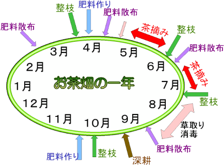| 7月〜8月 | 二番茶が終わると病気予防と害虫駆除のため、今年は3回の消毒を行いました。 これは、茶栽培において減農薬栽培の条件を満たしていますが、当園では、 減農薬栽培の表示は行っていません。  |